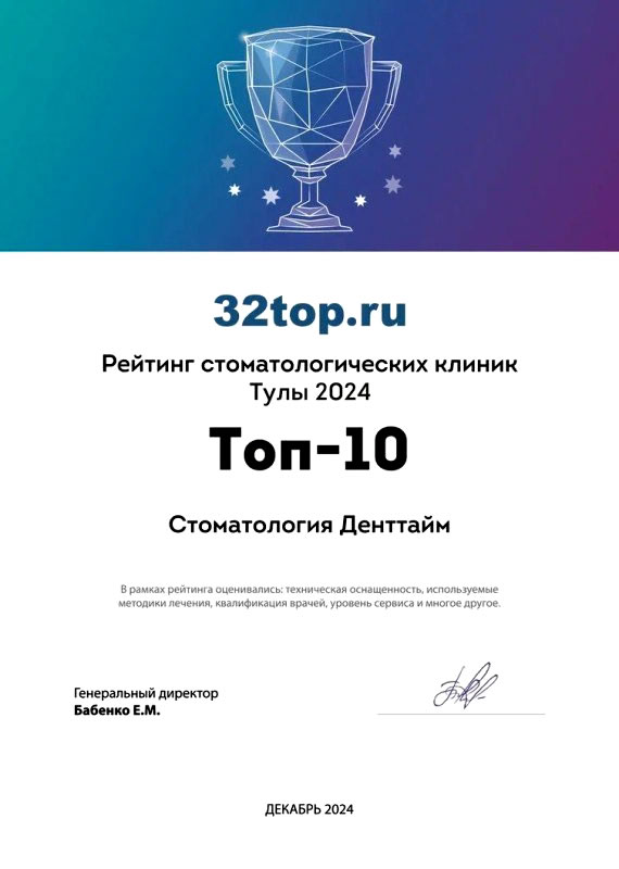 Клиника Денттайм вошла в ТОП 10 ежегодного рейтинга стоматологий Тулы 2024