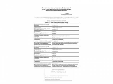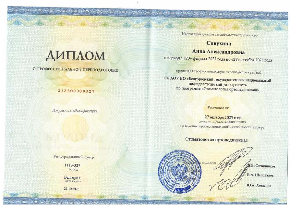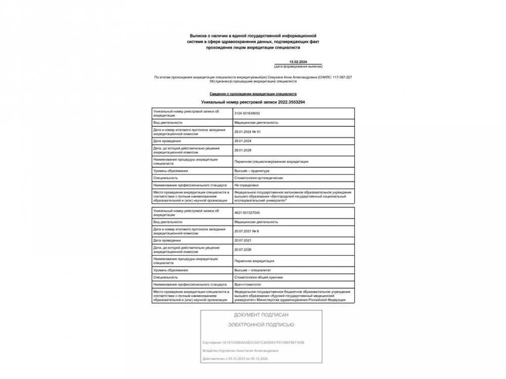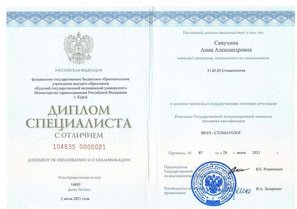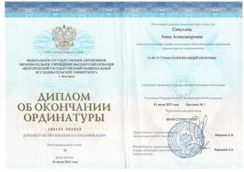 В 2021 году окончила федеральное государственное бюджетное образовательное учреждение высшего образования "Курский государственный медицинский университет" Министерства здравоохранения Российской Федерации г. Курск. Присвоена квалификация «врач-стоматолог» по специальности "стоматология". В 2023 году получен диплом об окончании ординатуры в ФГАОУ ВО "Белгородский государственный национальный исследовательский университет" г. Белгород, присвоена квалификация "врач-стоматолог" по специальности "стоматология общей практики". Имеет диплом о профессиональной переподготовке в ФГАОУ ВО "Белгородский государственный национальный исследовательский университет" по программе "Стоматология ортопедическая".